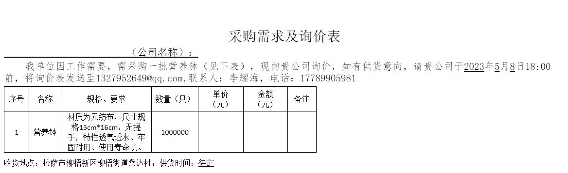 我單位因開展“花棒容器苗培育技術(shù)研究”試驗(yàn)需求,現(xiàn)需對采購營養(yǎng)缽進(jìn)行市場行情詢價(jià),采購詢價(jià)公告在西藏林業(yè)信息網(wǎng)公示,公告如下: