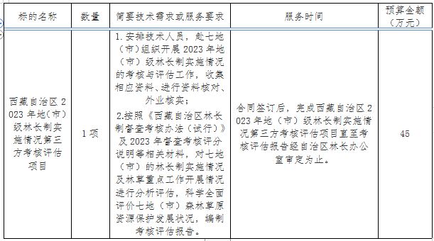 項(xiàng)目名稱:西藏自治區(qū)2023年地(市)林長(zhǎng)制實(shí)施情況第三方考核評(píng)估項(xiàng)目
