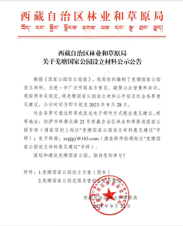西藏自治區(qū)林業(yè)和草原局關于羌塘國家公園設立材料公示公告