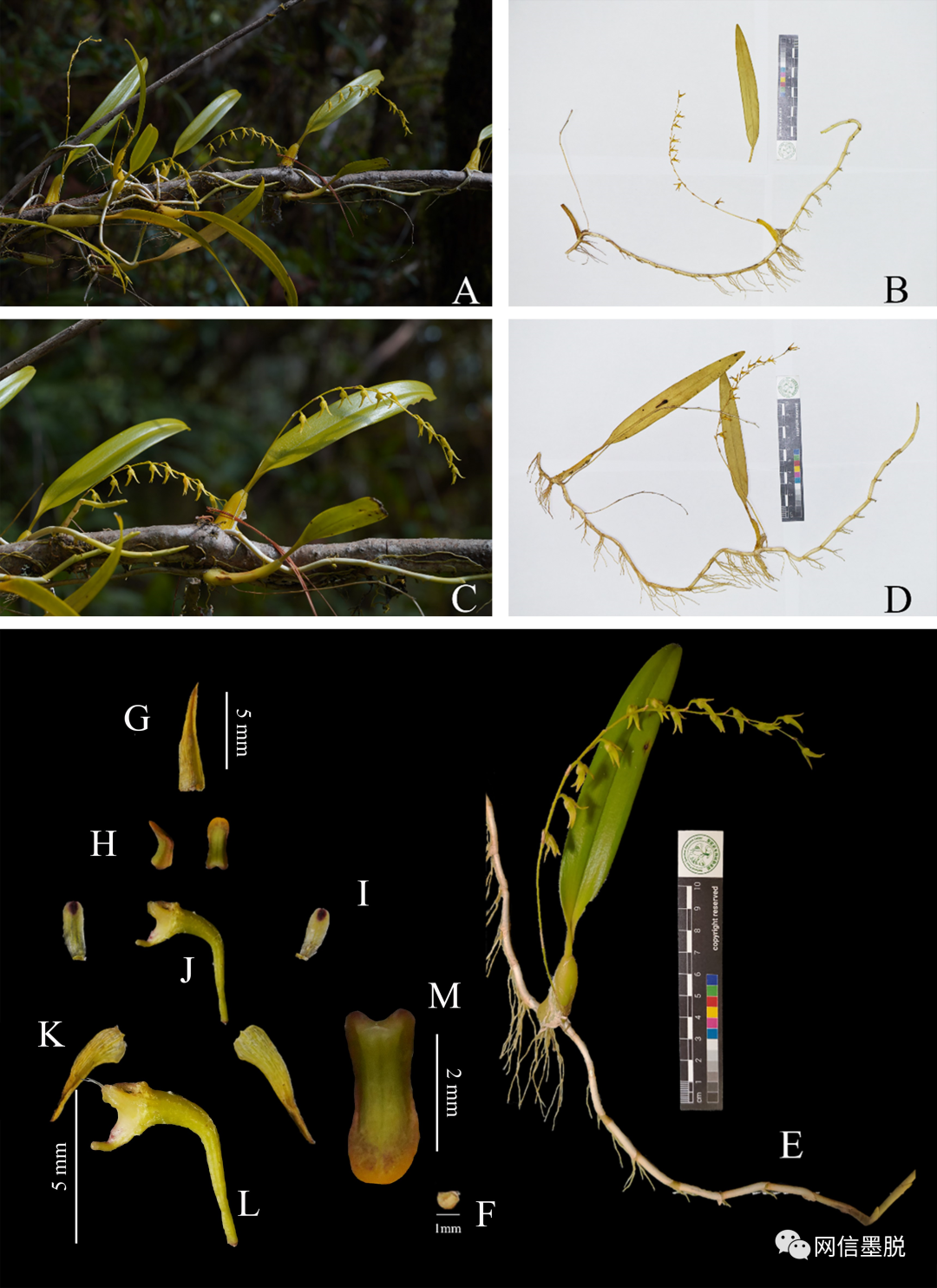 近日,福建農(nóng)林大學(xué)科研人員在背崩鄉(xiāng)德爾貢村的一次考察中發(fā)現(xiàn)了蘭科石豆蘭屬植物新種——德爾貢石豆蘭Bulbophyllum deergongense J.L.Miao & J.W.Zhai。該種屬于多年生附生草本,生于樹干。根狀莖纖細,粗2至3mm,光滑。具節(jié),每節(jié)長約2cm。節(jié)處有膜質(zhì)鞘,半圓形,長約5mm。節(jié)上有細根,長達6cm。假鱗莖在根狀莖疏生,彼此相距約15至20cm,長圓柱形,略四棱,有時有扭轉(zhuǎn),高2.5至4cm,直徑最寬處約有1cm,黃綠色,表面光滑,嫩時有鞘腐爛后的纖維。頂生一枚葉片,革質(zhì),長橢圓形,較硬,長約9至12cm,寬1.5至2cm,先端漸尖,葉尖不對稱分裂,基部楔形,葉柄長約1cm?;ㄐ蛏诋?dāng)年生假鱗莖基部,總狀,纖細,長18至23cm,著花12至15朵。每花梗基部著生灰綠色苞片一枚,長圓狀披針形,長1至2mm。花梗和子房長6至8mm。花小,黃綠色;中萼片1,長披針形,先端長漸尖,長約8mm,基部寬2至3mm,背面有棱,邊緣光滑;側(cè)萼片2,綠色,先端分離,基部合生,具1小凸起狀的囊,斜披針形,略彎曲,基部貼生在蕊柱足上,長約8mm,邊緣光滑;花瓣長卵圓形,長約3mm,寬約1mm,淡綠色,先端有一紫褐色圓形斑點,邊緣光滑;唇瓣肉質(zhì),牛舌形,向外下彎,長約3mm,先端鈍圓,綠色,中部凹陷,兩側(cè)紅褐色,中間綠色,背面中部綠色,兩側(cè)紅褐色;蕊柱長約1mm,有明顯2條纖毛狀蕊喙,長約1mm;蕊柱足長約2mm;花粉塊2。心形,具花粉團柄?;ㄆ?月。以上成果于2023年10月6日在《Phytotaxa》上首發(fā)報道。