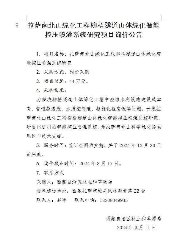 拉薩南北山綠化工程柳梧隧道山體綠化智能控壓噴灌系統(tǒng)研究項(xiàng)目詢價(jià)公告