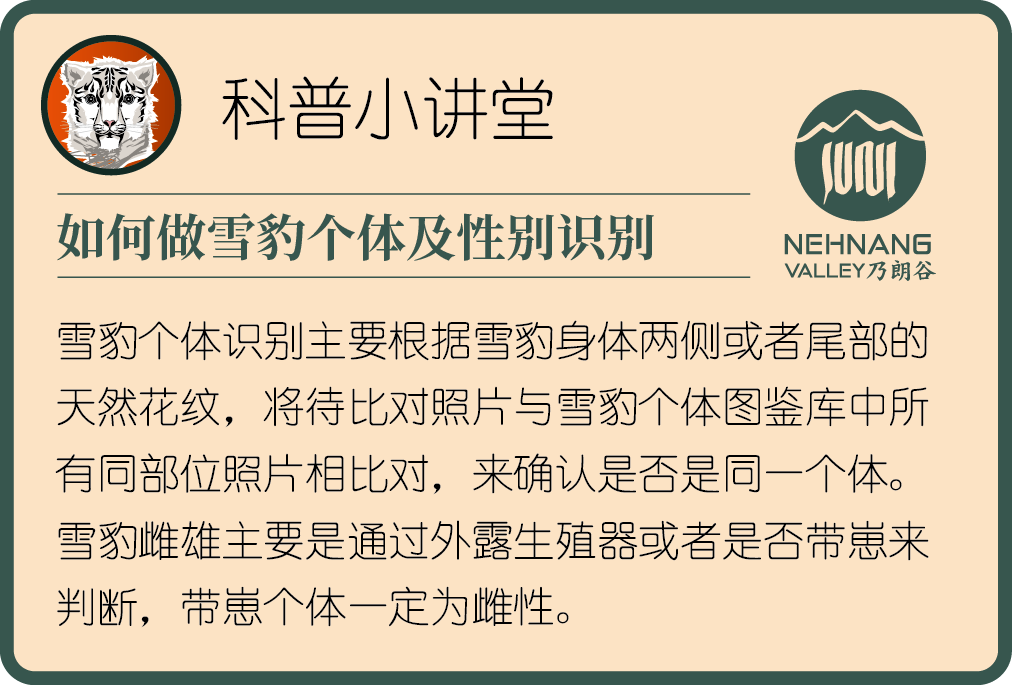 說(shuō)明:本文基于乃朗谷自然保護(hù)小區(qū)所布設(shè)的網(wǎng)格化紅外相機(jī)監(jiān)測(cè)影像數(shù)據(jù),同時(shí)結(jié)合了工作人員對(duì)野外環(huán)境和雪豹生活史及行為的觀察、分析與判斷,從而得出以上關(guān)于拉姆及其幼崽的一些結(jié)論和推斷。這種結(jié)合數(shù)據(jù)與經(jīng)驗(yàn)的方式幫助我們更全面地理解和記錄了這位“光榮媽媽”在乃朗谷中的生活軌跡。