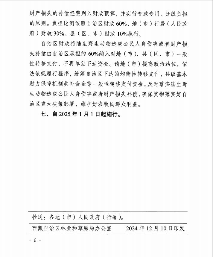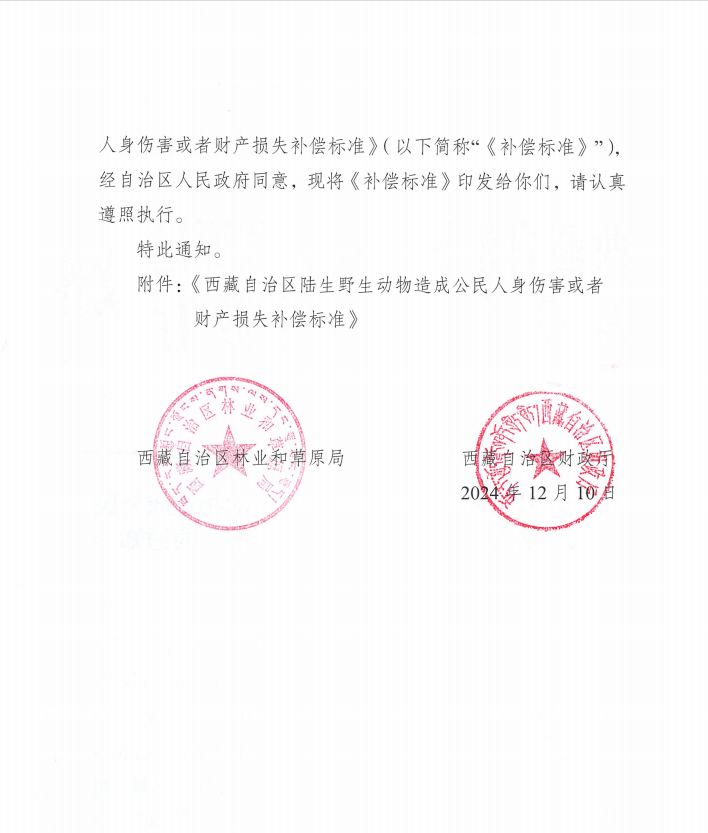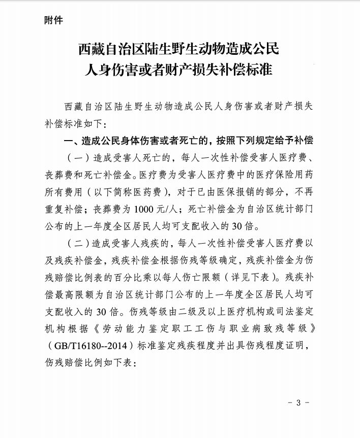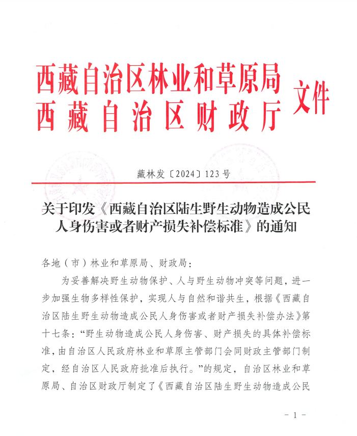 關(guān)于印發(fā)《西藏自治區(qū)陸生野生動物造成公民人身傷害或者財產(chǎn)損失補償標(biāo)準(zhǔn)》的通知