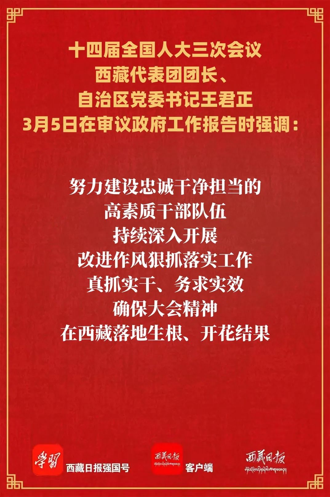 王君正強調(diào),今年是“十四五”規(guī)劃收官之年,要弘揚理論聯(lián)系實際的學(xué)風(fēng),堅決抓好大會精神的貫徹落實,以求真務(wù)實、真抓實干的作風(fēng),推動西藏長治久安和高質(zhì)量發(fā)展,努力建設(shè)社會主義現(xiàn)代化新西藏。認真學(xué)習(xí)領(lǐng)會大會精神,切實把思想和行動統(tǒng)一到黨中央決策部署上來,深刻領(lǐng)悟“兩個確立”的決定性意義,增強“四個意識”、堅定“四個自信”、做到“兩個維護”,主動把西藏工作置于黨和國家工作大局中思考、謀劃、推動,研究分析政府工作報告中提出的“十個方面”任務(wù),結(jié)合西藏實際提出切實可行的措施,真正把大會精神轉(zhuǎn)化為推動西藏各項事業(yè)發(fā)展的具體舉措,堅決維護社會大局持續(xù)穩(wěn)定,努力推動經(jīng)濟高質(zhì)量發(fā)展,扎實筑牢國家生態(tài)安全屏障,持續(xù)加強邊境地區(qū)建設(shè),科學(xué)有序推進定日地震災(zāi)后恢復(fù)重建,以優(yōu)異成績迎接西藏自治區(qū)成立60周年。加強黨的建設(shè),努力建設(shè)忠誠干凈擔當?shù)母咚刭|(zhì)干部隊伍,持續(xù)深入開展改進作風(fēng)狠抓落實工作,真抓實干、務(wù)求實效,確保大會精神在西藏落地生根、開花結(jié)果。