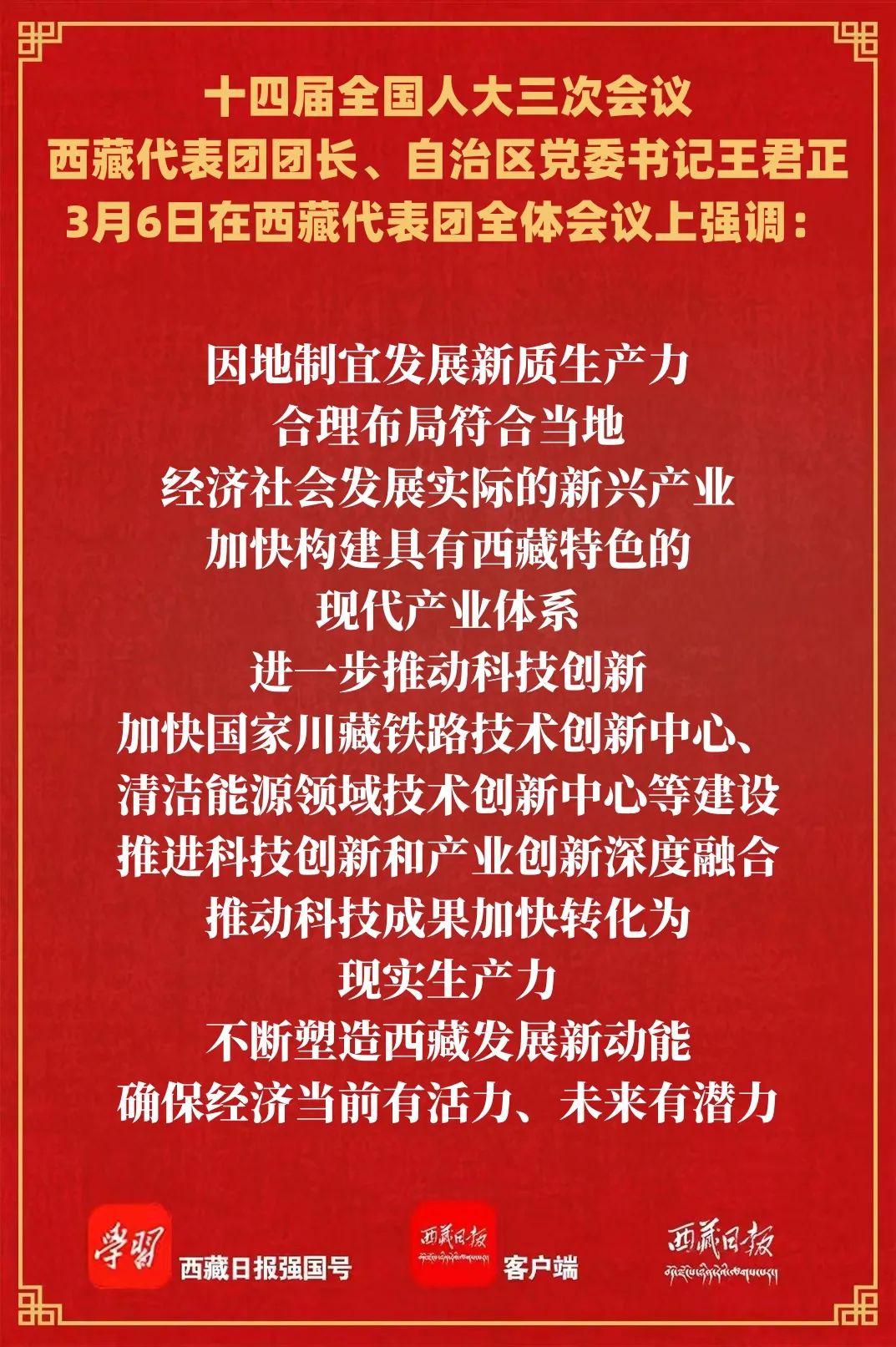 王君正強(qiáng)調(diào),要緊密結(jié)合西藏實(shí)際,抓好習(xí)近平總書(shū)記重要講話精神貫徹落實(shí),努力推動(dòng)西藏長(zhǎng)治久安和高質(zhì)量發(fā)展。弘揚(yáng)理論聯(lián)系實(shí)際的學(xué)風(fēng),完整準(zhǔn)確全面貫徹新發(fā)展理念,聚焦“四件大事”聚力“四個(gè)創(chuàng)建”,把“三個(gè)賦予一個(gè)有利于”總要求貫穿經(jīng)濟(jì)社會(huì)發(fā)展全過(guò)程,突出重點(diǎn)、統(tǒng)籌兼顧,推動(dòng)長(zhǎng)治久安和高質(zhì)量發(fā)展不斷取得新進(jìn)步,確保習(xí)近平總書(shū)記重要指示和黨中央決策部署在西藏落地生根、開(kāi)花結(jié)果。堅(jiān)持以新質(zhì)生產(chǎn)力引領(lǐng)產(chǎn)業(yè)發(fā)展,因地制宜發(fā)展新質(zhì)生產(chǎn)力,合理布局符合當(dāng)?shù)亟?jīng)濟(jì)社會(huì)發(fā)展實(shí)際的新興產(chǎn)業(yè),加快構(gòu)建具有西藏特色的現(xiàn)代產(chǎn)業(yè)體系;進(jìn)一步推動(dòng)科技創(chuàng)新,加快國(guó)家川藏鐵路技術(shù)創(chuàng)新中心、清潔能源領(lǐng)域技術(shù)創(chuàng)新中心等建設(shè),推進(jìn)科技創(chuàng)新和產(chǎn)業(yè)創(chuàng)新深度融合,推動(dòng)科技成果加快轉(zhuǎn)化為現(xiàn)實(shí)生產(chǎn)力,不斷塑造西藏發(fā)展新動(dòng)能,確保經(jīng)濟(jì)當(dāng)前有活力、未來(lái)有潛力。進(jìn)一步深化改革開(kāi)放,開(kāi)放的地區(qū)最有活力、開(kāi)放的經(jīng)濟(jì)最有競(jìng)爭(zhēng)力,要圍繞融入全國(guó)統(tǒng)一大市場(chǎng)機(jī)制,深化要素市場(chǎng)化配置改革,深化重點(diǎn)領(lǐng)域改革,堅(jiān)持明確所有權(quán)、放活經(jīng)營(yíng)權(quán)、強(qiáng)化管理權(quán)、落實(shí)監(jiān)督權(quán)、規(guī)范處置權(quán),把國(guó)企改革逐步引向深入,加快民營(yíng)企業(yè)發(fā)展,積極擴(kuò)大對(duì)外開(kāi)放,為經(jīng)濟(jì)發(fā)展注入強(qiáng)大動(dòng)力。堅(jiān)決落實(shí)國(guó)家重大發(fā)展戰(zhàn)略,深入貫徹落實(shí)習(xí)近平總書(shū)記在新時(shí)代推動(dòng)西部大開(kāi)發(fā)座談會(huì)上的重要講話精神,緊緊抓住新時(shí)代推進(jìn)西部大開(kāi)發(fā)重大機(jī)遇,積極融入成渝地區(qū)雙城經(jīng)濟(jì)圈、西部陸海新通道等國(guó)家重大戰(zhàn)略,著力促進(jìn)城鄉(xiāng)融合發(fā)展,持續(xù)加強(qiáng)邊境地區(qū)建設(shè),努力打造西藏經(jīng)濟(jì)高質(zhì)量發(fā)展增長(zhǎng)極。牢固樹(shù)立以人民為中心的發(fā)展思想,堅(jiān)持就業(yè)優(yōu)先導(dǎo)向,著力提升教育質(zhì)量,持續(xù)提升文化惠民,提高人民群眾健康水平,切實(shí)增強(qiáng)各族群眾的獲得感幸福感安全感。