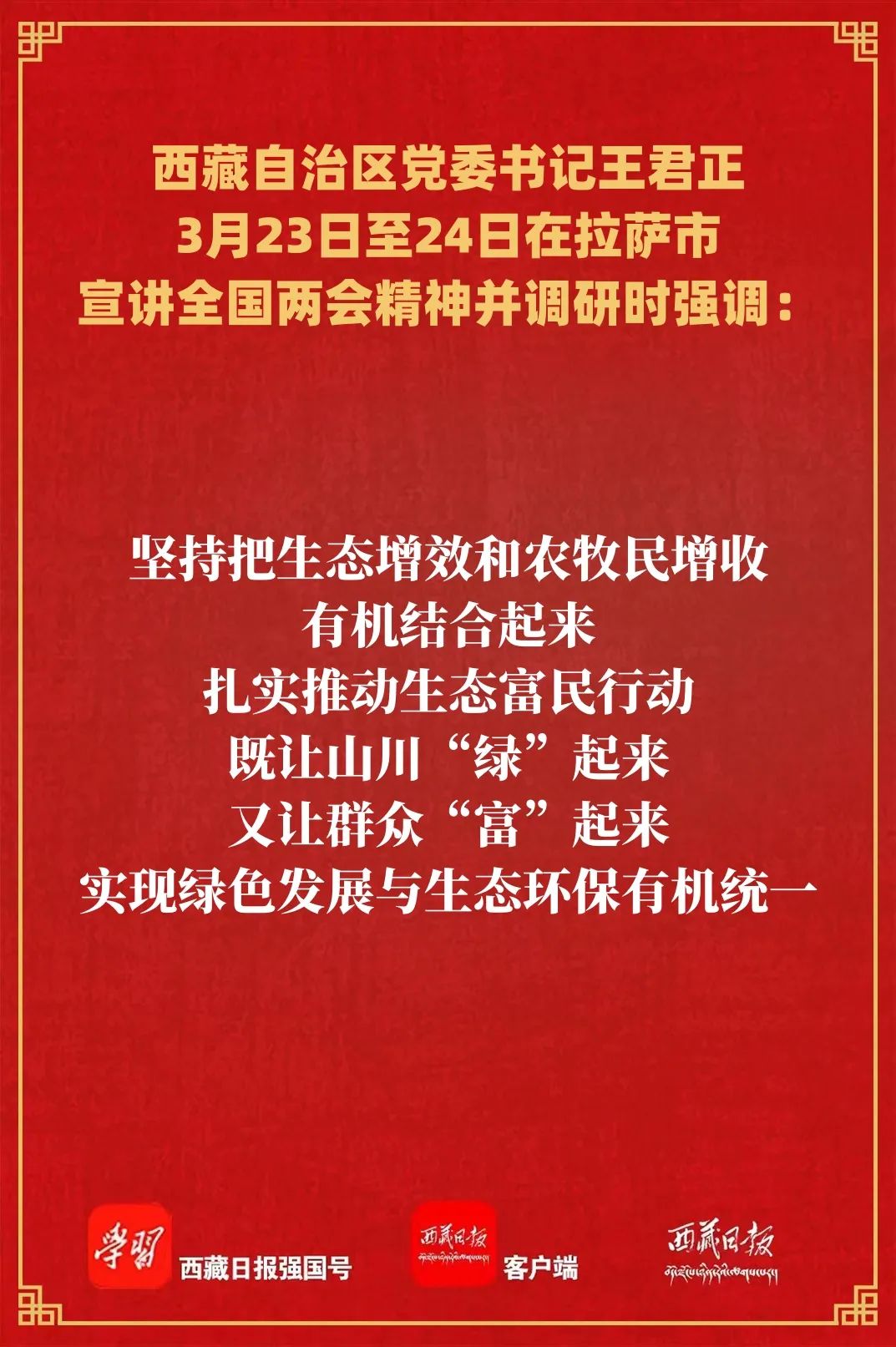 3月23日至24日,自治區(qū)黨委書記王君正前往拉薩市達(dá)孜區(qū)、墨竹工卡縣宣講全國(guó)兩會(huì)精神,就農(nóng)業(yè)生產(chǎn)、生態(tài)環(huán)保、產(chǎn)業(yè)發(fā)展、寺廟管理開展調(diào)研。強(qiáng)調(diào),要深入貫徹落實(shí)習(xí)近平總書記在全國(guó)兩會(huì)期間重要講話和全國(guó)兩會(huì)精神,堅(jiān)定信心、鼓足干勁,發(fā)揮中心城市輻射帶動(dòng)作用,扎實(shí)推動(dòng)“四件大事”落實(shí),努力當(dāng)好全區(qū)長(zhǎng)治久安和高質(zhì)量發(fā)展排頭兵。