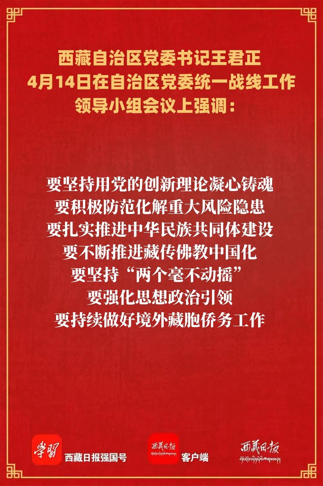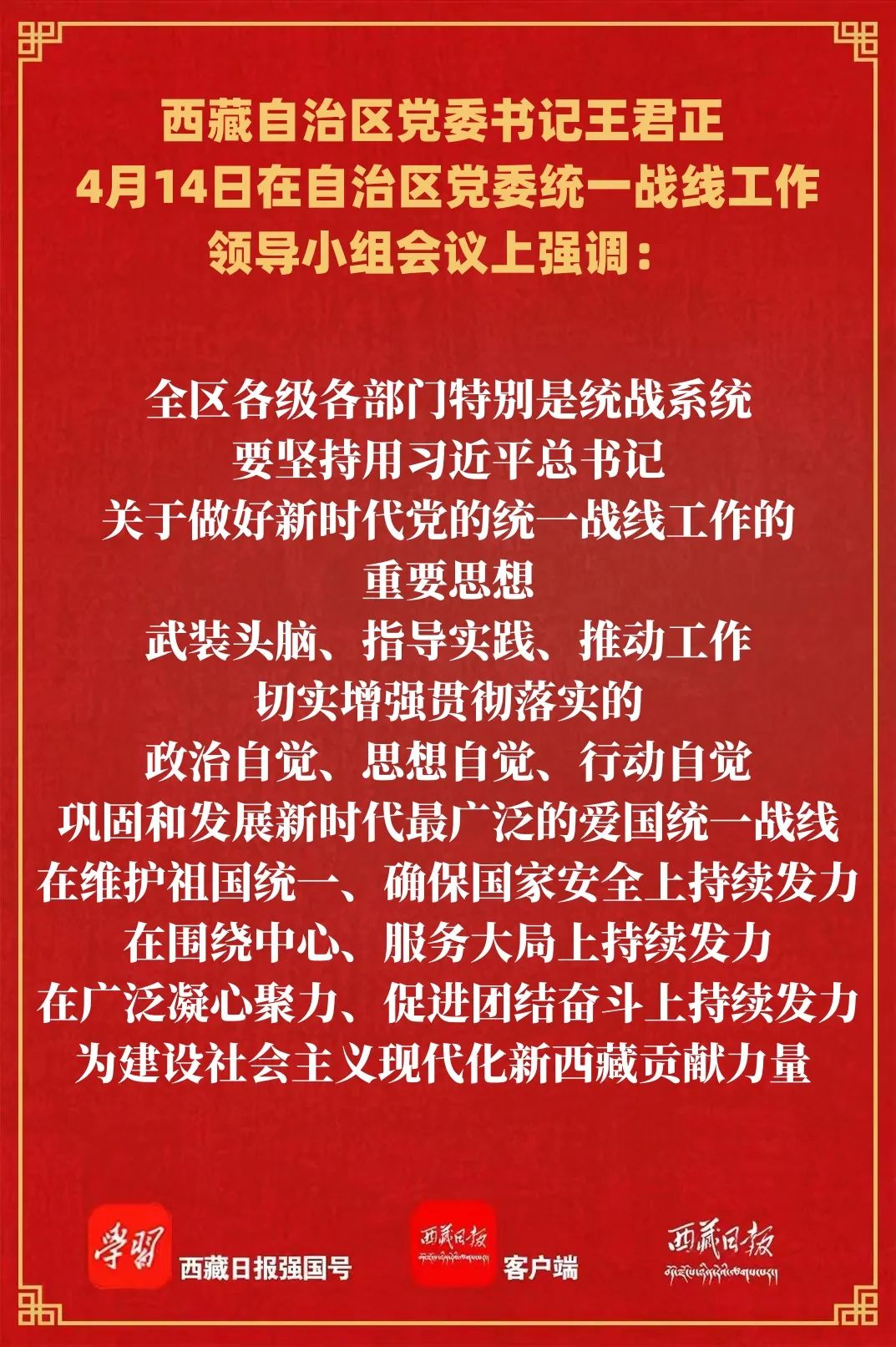 4月14日,自治區(qū)黨委書記王君正主持召開自治區(qū)黨委統(tǒng)一戰(zhàn)線工作領(lǐng)導(dǎo)小組會議,傳達(dá)學(xué)習(xí)習(xí)近平總書記重要講話精神和中央有關(guān)會議、文件精神,聽取全區(qū)統(tǒng)戰(zhàn)工作情況匯報,研究部署下一步工作。他強(qiáng)調(diào),要深入學(xué)習(xí)貫徹習(xí)近平總書記關(guān)于做好新時代黨的統(tǒng)一戰(zhàn)線工作的重要思想,不斷提高全區(qū)統(tǒng)戰(zhàn)工作水平,為建設(shè)社會主義現(xiàn)代化新西藏凝聚強(qiáng)大力量。