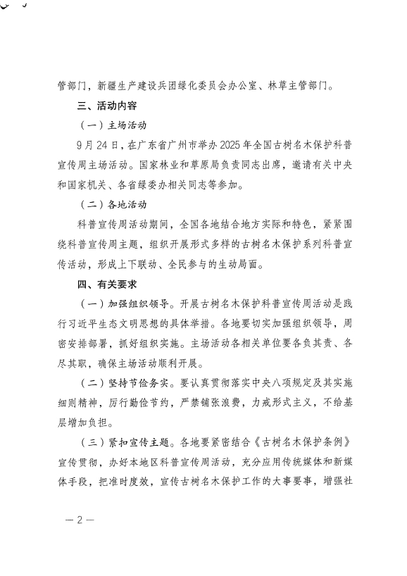 全國(guó)綠化委員會(huì)辦公室關(guān)于開展2025年全國(guó)古樹名木保護(hù)科普宣傳周活動(dòng)的通知