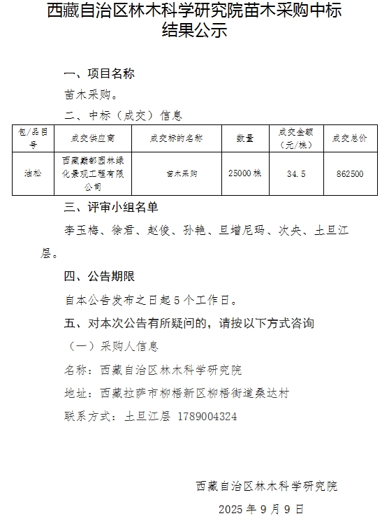 西藏自治區(qū)林木科學(xué)研究院苗木采購中標(biāo)結(jié)果公示