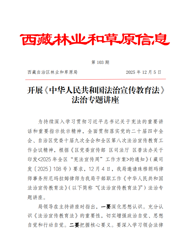 西藏自治區(qū)林業(yè)和草原局關(guān)于開(kāi)展《中華人民共和國(guó)法制宣傳教育法》法制專(zhuān)題講座