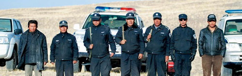 整個(gè)那曲地區(qū),土地面積達(dá)42萬(wàn)平方公里,占全西藏自治區(qū)國(guó)土面積的三分之一。特殊的地理位置和獨(dú)特的生態(tài)環(huán)境為野生動(dòng)物提供了得天獨(dú)厚的棲息繁衍場(chǎng)所,據(jù)國(guó)內(nèi)外專家考察論證,這里生息繁衍著110多種野生動(dòng)物,東部森林覆蓋面積達(dá)到562011公頃,素有“天然的野生動(dòng)物樂(lè)園”之稱。其中,被國(guó)家、自治區(qū)列為保護(hù)名錄的一、二級(jí)保護(hù)野生動(dòng)物有40余種,尤以野牦牛、藏野驢、藏羚羊、雪豹、金錢豹、黑頸鶴、白唇鹿、盤羊、巖羊、麝等最為珍貴。其中,藏羚羊、雪豹、藏野驢、野牦牛和黑頸鶴等都是國(guó)際野生動(dòng)植物貿(mào)易公約附錄一的物種。守護(hù)著這些高原生靈的主要力量,就是當(dāng)?shù)氐牧謽I(yè)局和森林公安局的團(tuán)隊(duì)。西藏自治區(qū)那曲地區(qū)林業(yè)局和森林公安局(野生動(dòng)物保護(hù)科)成立于1993年,到2009年,該團(tuán)隊(duì)共有18人,下屬縣級(jí)森林公安有8個(gè),共26人。這個(gè)團(tuán)隊(duì)的監(jiān)管區(qū)域有42萬(wàn)平方公里,人均負(fù)責(zé)面積達(dá)5萬(wàn)平方公里,其中有將近20萬(wàn)幾乎都屬于無(wú)人區(qū)。他們面對(duì)的是一片平均海拔高于4500米的廣袤區(qū)域,平均年氣溫在10度左右,冬天最低溫度達(dá)零下30-40度。這片區(qū)域東接可可西里、北環(huán)昆侖山脈,西部是同樣環(huán)境的阿里地區(qū),南部橫臥念青唐古拉。東部、北部和西部沒(méi)有險(xiǎn)峻地勢(shì)作為屏障,有眾多可以進(jìn)入無(wú)人區(qū)域的通道。所以要守護(hù)這片世界上屈指可數(shù)的區(qū)域,使得生活在其中的動(dòng)物能夠無(wú)憂的生活,對(duì)于這支年輕的團(tuán)隊(duì)而言,任務(wù)艱巨。