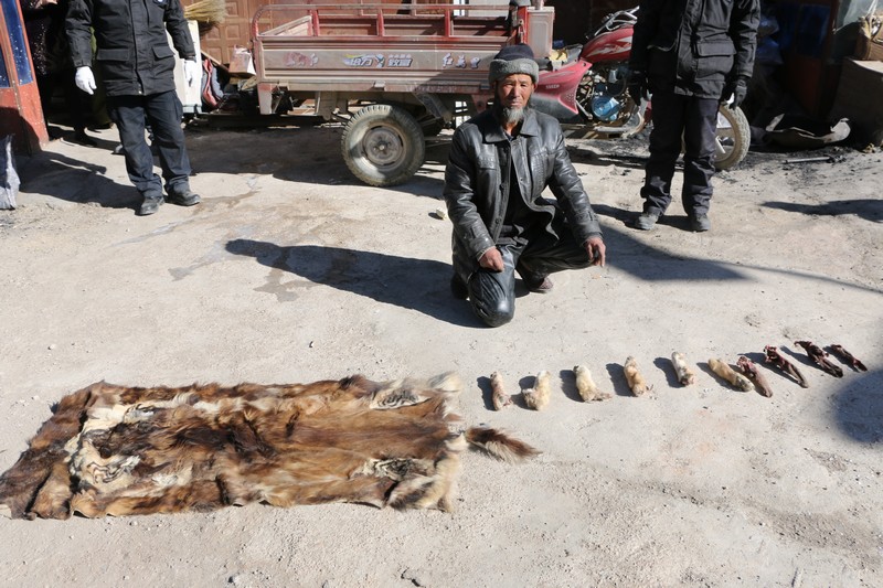 此次行動(dòng),我專項(xiàng)行動(dòng)小組出動(dòng)警車5輛,警力17人,有重點(diǎn)的對(duì)我縣縣城的毛皮交易市場、飯店、商鋪等地進(jìn)行全面清理檢查,對(duì)非法獵捕、販賣、加工、食用野生動(dòng)物違法犯罪進(jìn)行打擊。著重力度檢查整頓了我縣幾家較大的皮張收購商,經(jīng)搜查發(fā)現(xiàn)一家經(jīng)營者存在違法行為,對(duì)于非法收購的野生動(dòng)物制品一律予以沒收,對(duì)違法經(jīng)營者進(jìn)行警告教育及罰款。此次行動(dòng)收繳自治區(qū)一級(jí)保護(hù)動(dòng)物狼小腿6只,狼舌頭4個(gè),國家一級(jí)保護(hù)動(dòng)物北山羊皮1張。