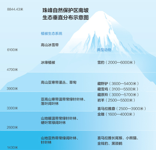 從海拔1400多米的南部河谷地帶一直攀升到珠穆朗瑪峰,珠峰自然保護(hù)區(qū)的相對高度落差達(dá)7400多米,擁有全球獨(dú)一無二的極高山生態(tài)系統(tǒng),原始的山地森林生態(tài)系統(tǒng)以及半干旱荒漠灌叢、草原生態(tài)系統(tǒng),成為全球最豐富獨(dú)特的天然物種基因庫。