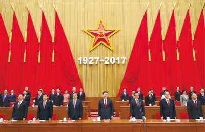 人民大會堂大禮堂氣氛莊嚴(yán)而熱烈。主席臺上方懸掛著“慶祝中國人民解放軍建軍90周年大會”會標(biāo),帷幕正中是中國人民解放軍軍徽和“1927-2017”字標(biāo),10面紅旗分列兩側(cè)。大禮堂二層眺臺懸掛標(biāo)語:緊密團(tuán)結(jié)在以習(xí)近平同志為核心的黨中央周圍,不忘初心、繼續(xù)前進(jìn),為實(shí)現(xiàn)黨在新形勢下的強(qiáng)軍目標(biāo)、把人民軍隊建設(shè)成為世界一流軍隊,為實(shí)現(xiàn)“兩個一百年”奮斗目標(biāo)、實(shí)現(xiàn)中華民族偉大復(fù)興的中國夢而努力奮斗!