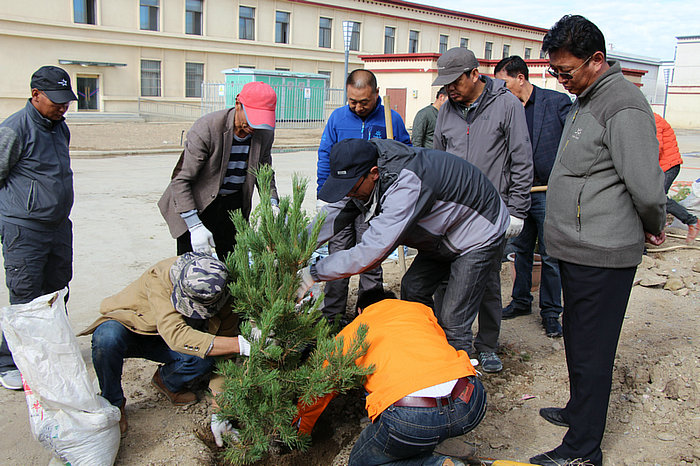 專家組結(jié)合那曲地區(qū)高寒氣候、土壤呈堿性的特點(diǎn),對那曲地區(qū)林業(yè)局技術(shù)人員進(jìn)行了苗木定植關(guān)鍵技術(shù)講解和現(xiàn)場示范操作培訓(xùn),著重對不同樹種的定植深度、根系修剪、培土、正苗、灌水等技術(shù)環(huán)節(jié)進(jìn)行了指導(dǎo),使參訓(xùn)人員掌握栽培措施和管護(hù)要點(diǎn)。為規(guī)范造林規(guī)程,做好在那曲地區(qū)兒童福利院栽植的爬地柏、大果圓柏、尼泊爾錦雞兒、絹毛薔薇和樟子松樹種的試種,專家組提出了加強(qiáng)后期日常管理的具體要求。此次提供以爬地柏等五種鄉(xiāng)土樹種共220株,總價值近7萬元。
