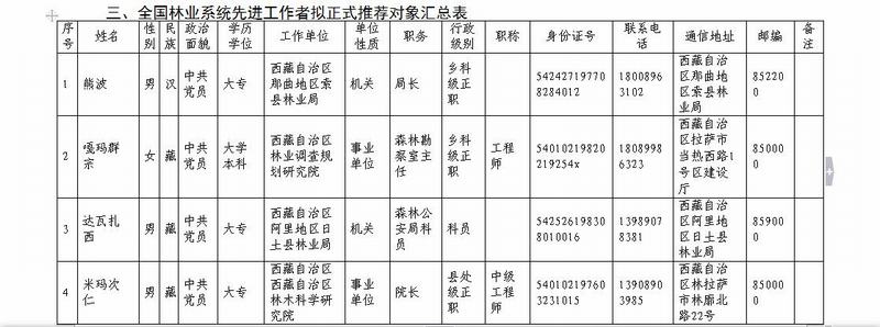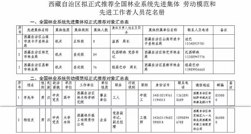 先進(jìn)集體正式推薦意見:西藏自治區(qū)山南市浪卡子縣林業(yè)局、西藏自治區(qū)林芝市林業(yè)局、西藏自治區(qū)昌都市林業(yè)局