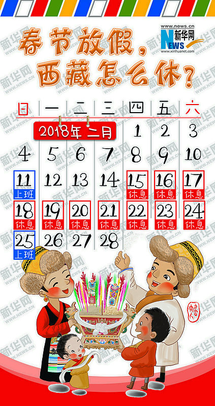 2018年春節(jié)及藏歷土狗新年放假10天。即:2018年2月15日至2月24日放假調(diào)休。2月11日(星期日)、2月25日(星期日)照常上班。
