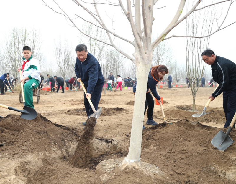 4月2日,黨和國家領(lǐng)導(dǎo)人習(xí)近平、李克強(qiáng)、栗戰(zhàn)書、汪洋、王滬寧、趙樂際、韓正、王岐山等來到北京市通州區(qū)張家灣鎮(zhèn)參加首都義務(wù)植樹活動。這是習(xí)近平同大家一起植樹。新華社記者 謝環(huán)馳 攝