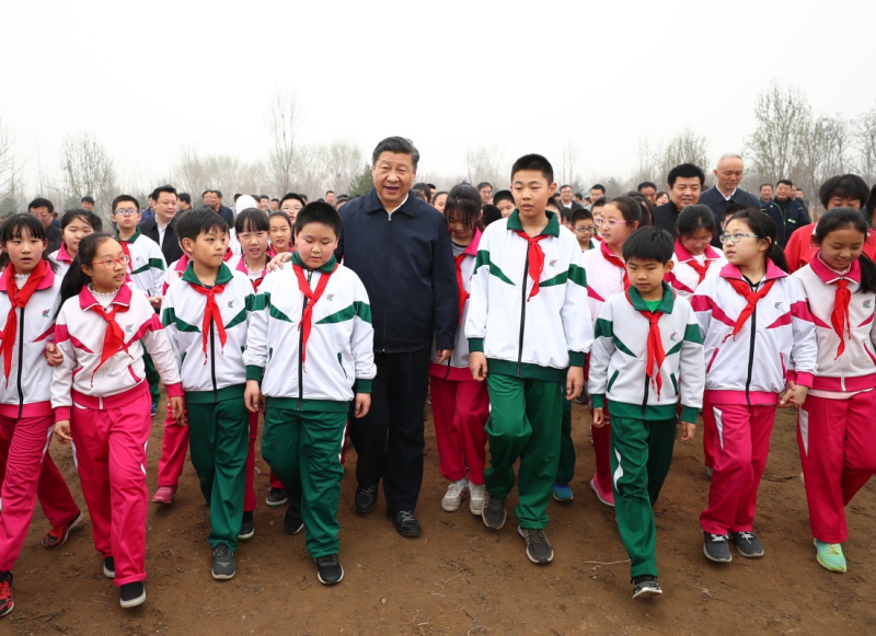 4月2日,黨和國家領(lǐng)導(dǎo)人習(xí)近平、李克強(qiáng)、栗戰(zhàn)書、汪洋、王滬寧、趙樂際、韓正、王岐山等來到北京市通州區(qū)張家灣鎮(zhèn)參加首都義務(wù)植樹活動。這是植樹活動結(jié)束時習(xí)近平同少先隊員在一起。新華社記者 謝環(huán)馳 攝