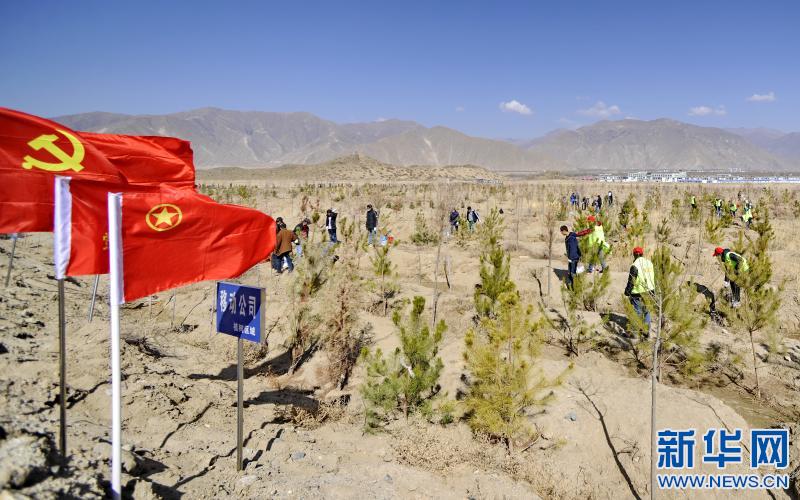 2018年3月22日,中國移動西藏公司的志愿者在拉薩市曲水縣才納鄉(xiāng)吉祥四季村林地義務植樹造林。新華社記者 張汝鋒 攝