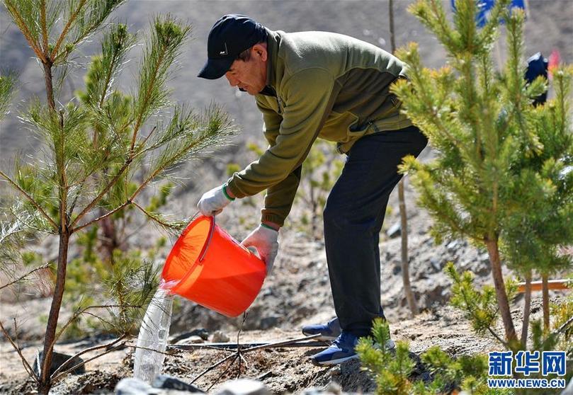 2018年3月22日,在拉薩市曲水縣才納鄉(xiāng)吉祥四季村林地,一名志愿者為新栽的樹苗澆水。新華社記者 張汝鋒 攝