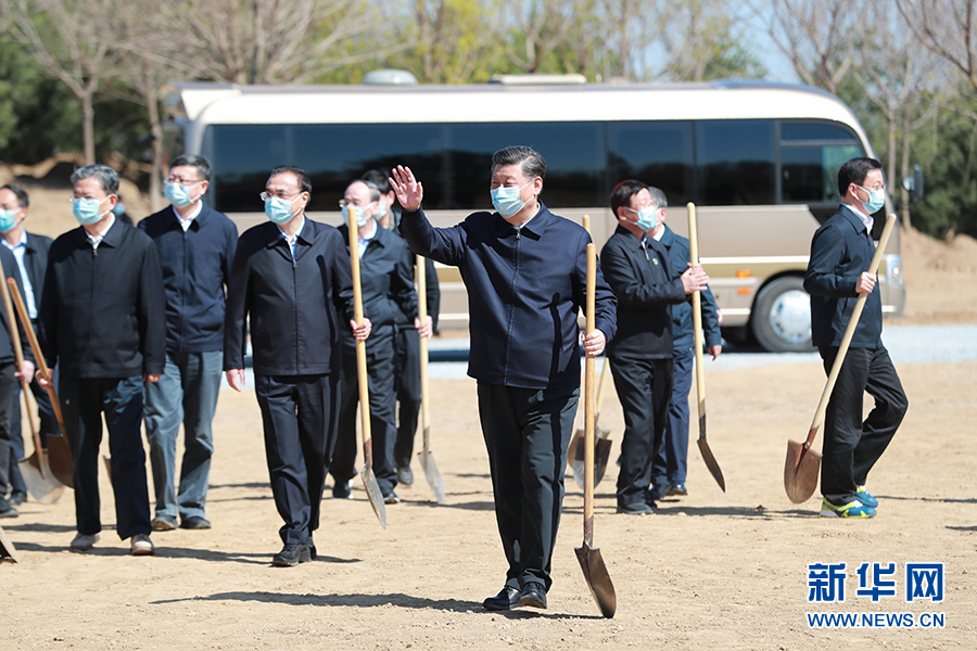 4月3日,黨和國家領(lǐng)導人習近平、李克強、栗戰(zhàn)書、汪洋、王滬寧、趙樂際、韓正、王岐山等來到北京市大興區(qū)舊宮鎮(zhèn)參加首都義務植樹活動。這是習近平拿起鐵鍬走向植樹地點,向正在植樹的干部群眾揮手致意。 新華社記者 龐興雷 攝