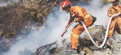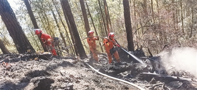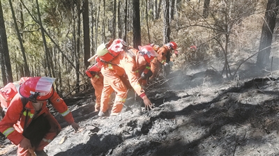 4月5日凌晨4時,隊伍在熟悉當(dāng)?shù)氐匦蔚南驅(qū)ьI(lǐng)下,沿著陡峭的羊腸小道像巖羊一樣在山石間攀緣前進(jìn)。到達(dá)山頂后,隊員們采取多點(diǎn)突破分段阻擊的戰(zhàn)術(shù),沿火線邊挖隔離帶邊清理邊緣火。分段作業(yè)完成后,隊員們開始清理跡地余火,當(dāng)日,火場就被控制下來,第二天便轉(zhuǎn)入清理值守階段。4月7日,隊員們拖著疲憊的身軀回到營區(qū)。