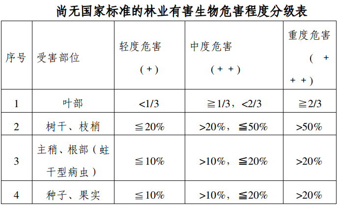 林業(yè)有害生物危害程度的分級(jí)標(biāo)準(zhǔn)按國家林業(yè)局制定的《林業(yè)有害生物發(fā)生及成災(zāi)標(biāo)準(zhǔn)》(LY/T 1681-2006)進(jìn)行統(tǒng)計(jì),尚無國家標(biāo)準(zhǔn)的可按附表1的標(biāo)準(zhǔn)進(jìn)行統(tǒng)計(jì)。