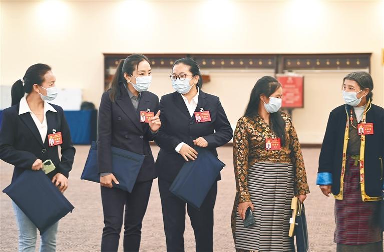 圖為來自我區(qū)基層的部分黨的二十大代表在會議間隙就共同關注的話題展開熱烈討論。 記者 旦增西旦 攝