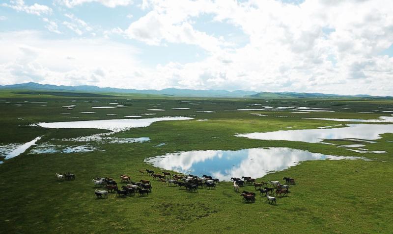 河曲馬在甘肅省甘南藏族自治州瑪曲縣河曲馬場(chǎng)的濕地奔跑(無(wú)人機(jī)照片)。新華社記者 陳斌 攝
