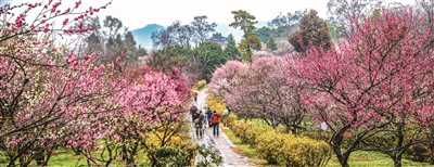 浙江長興縣栽種梅樹產梅果已有1400多年的歷史。幾年前,傳統(tǒng)的果梅價格低迷,當?shù)剞r民將果梅嫁接成花梅,通過賞花旅游實現(xiàn)增收致富。目前,全縣梅花種植規(guī)模達5.1萬畝,惠及梅農7000余家,其中紅梅面積近2萬畝,是“中國青梅之鄉(xiāng)”“中國紅梅之鄉(xiāng)”。