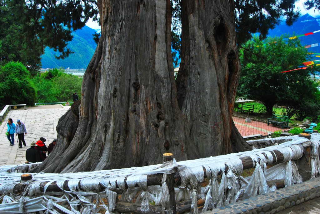從谷底稍稍抬頭看,一片蓊郁的巨樹林凸顯于山坡上,具有塔形的樹冠和挺拔的樹干,四周是一叢叢低矮的灌木林。究竟緣起,已然是千古之謎。古巨柏林在當?shù)夭刈迦罕娦哪恐惺鞘サ?,傳說苯教開山祖師辛饒米保的生命樹即是古柏,所以林中那些最大最古老的樹身上總是纏掛著哈達、風馬,樹林中到處可見大小不一的瑪尼堆,經(jīng)常有信徒遠道而來,向這些寄居著神人靈魂的古樹朝拜。