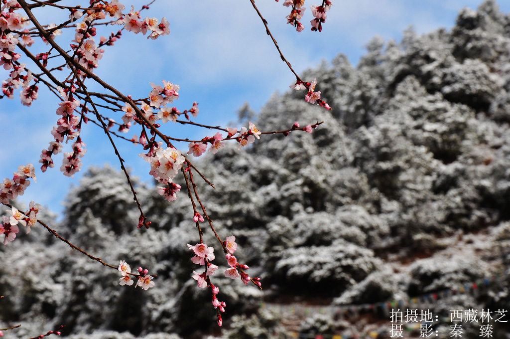 風景照:春分桃花雪景。農歷春分時,西藏林芝的桃花剛剛始現,此時在山脊雪景的映襯下格外嬌嬈。