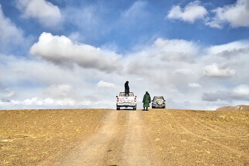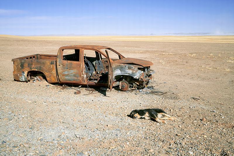 2.一輛燒爛的卡車躺在前往羌塘的路邊,高原上的風用力吹響破車的每一個部件。它無意侵入了一只野狗的領(lǐng)地,野狗也大方地將其占為己有。偶爾有人路過,野狗會全速跑過來打招呼,討點吃的再目送行人離開。