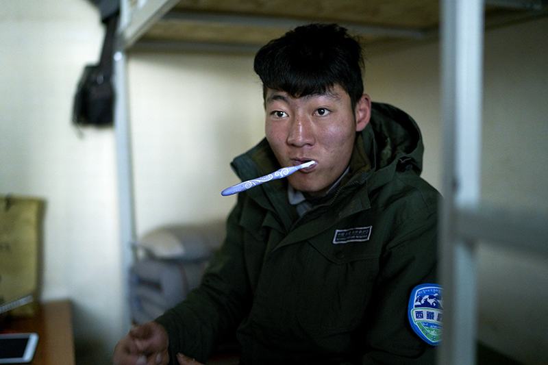 7.亞阿木管理站是通往冰川途中唯一的檢查站,站里8個年輕人常年在這里看守。站長桑噶今年32歲,是站里唯一的80后。野保隊員一年只有30天假期,其余時間都在無人區(qū)的腹地中巡邏。桑噶的妻女就在羌塘所屬的雙湖縣,雖然一家相聚只有四十多公里,但是鮮有團聚的機會。