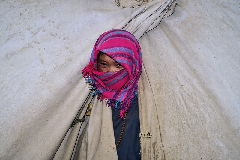 19.游牧女孩聽見靠近的車聲,探出頭來,圍巾被大風吹得亂擺,卻遮不住女孩的笑容。