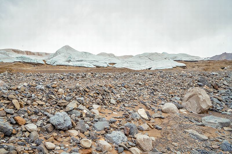 4.普若崗日冰川側(cè)臥在連綿的山脈千萬年,腳下的碎石是它生長、移動的證據(jù)。冰被風刮出了魚鱗的樣子,用手觸摸一下能讓你心都發(fā)涼。它是所有探險者都想挑戰(zhàn)的對象,通過它,之后的路一馬平川。