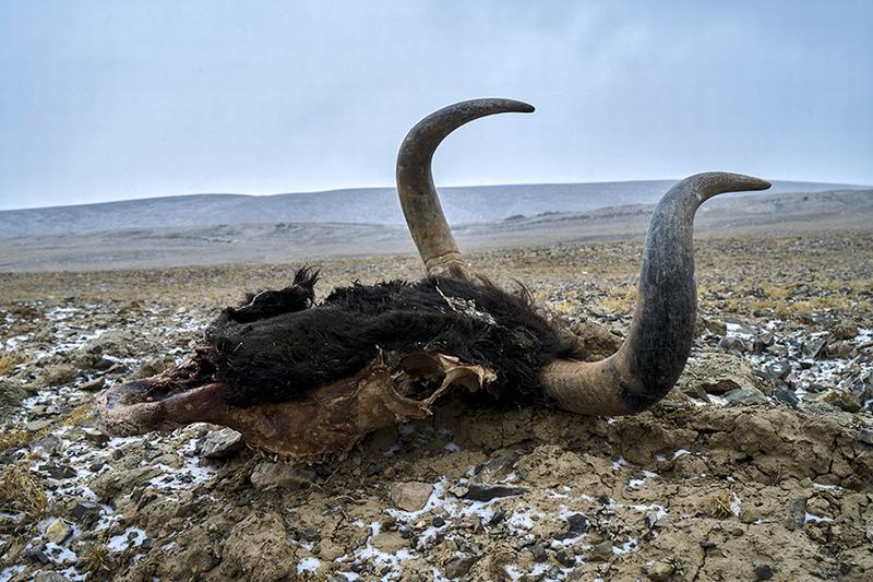 6.一顆野牦牛的空頭骨,被捕食者輕易留在路邊。低溫將任何液體都凝成了冰,它的毛發(fā)直挺挺貼在上面。遠方的山頭,野牦牛的伙伴圍在一起,撕咬碎石縫里擠出的草。牛蹄踏過,塵土飛揚嗒嗒響。