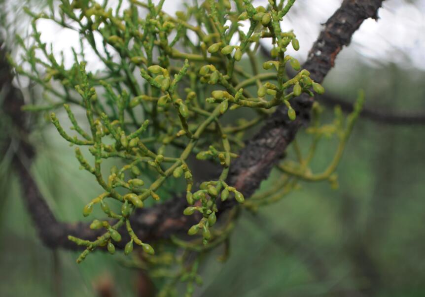 每年春季,高山松寄生也開始吐出新綠,煥發(fā)出勃勃生機,當(dāng)然,在此前的冬季,它就那么一直陪著高山松共同經(jīng)受風(fēng)霜雪雨的洗禮。畢竟,它是常綠灌木,有著堅忍的一面。不曾有人見過它的葉子,也許它們曾經(jīng)美麗,但愛上高山松的偉岸,注定自己也要有所修煉,葉子退化掉不要緊,至少可以在高寒、干旱的環(huán)境里與愛人相濡以沫。